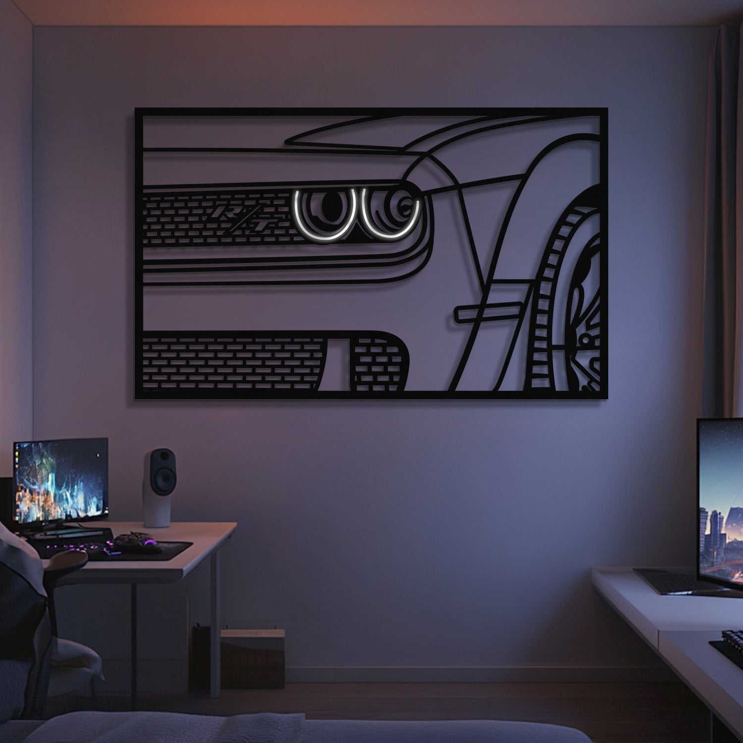 This 2015-2023 Challenger R/T Apex Front View Metal Neon Frame Wall Art will turn any car enthusiast's home, garage, hallway, living room, bedroom, or office into a unique space, add a stylistic look and captivate petrolheads as well as visitors.