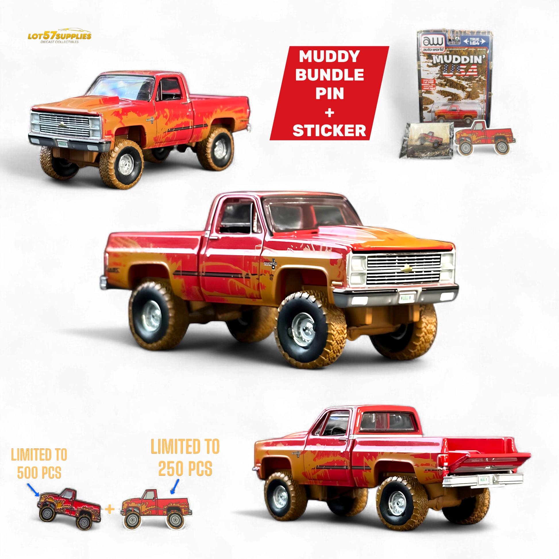 Auto World 1983 Chevrolet Silverado K10 4x4 Muddy LIFTED Squarebody 1:64 BUNDLE 1:64