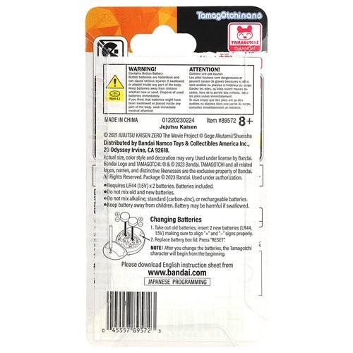 Fight curses and train sorcerers from Jujutsu Kaisen 0: The Movie. This Tamagotchi Nano features a shell designed to look like Gojo's eye wrappings and cursed energy! Feed your character when hungry, give them a snack when they are in a bad mood, and play three different mini-games. Your play pattern will determine which of the 13 characters Satoru Gojo will introduce you to. If you neglect your characters, they will leave. The Jujutsu Kaisen 0 Satoru Gojo Tamagotchi Nano Digital Pet measures about 1 1/2-inches tall x 1 1/5-inches wide x 1-inch long. Requires 2x "LR44" batteries, which come included. Ages 8 and up.