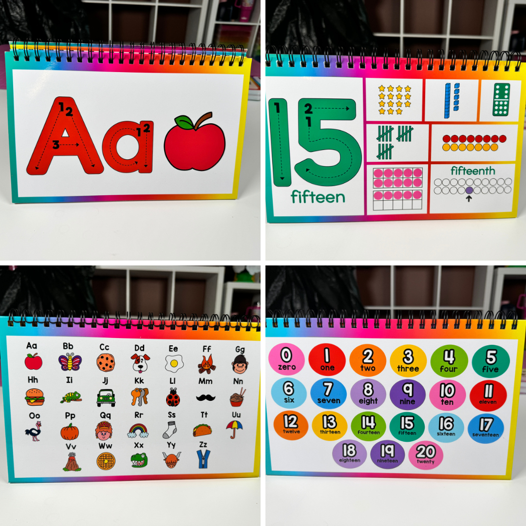 A reusable, laminated flip chart featuring the alphabet, numbers, and shapes. Students trace with dry-erase markers to build fine motor skills and handwriting confidence.