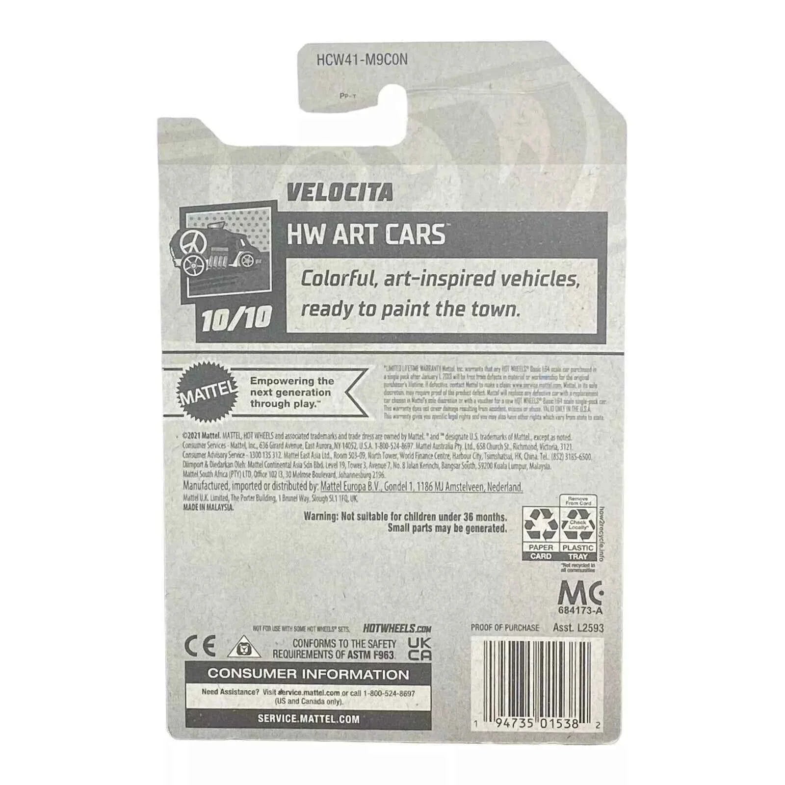 The thrill of collecting meets the joy of artistry with the Hot Wheels Velocita - Art Cars Series 10/10. Whether you’re zooming around on the track or displaying it proudly on your shelf, this model is designed to captivate and inspire. Don’t miss the chance to add this remarkable piece to your collection!