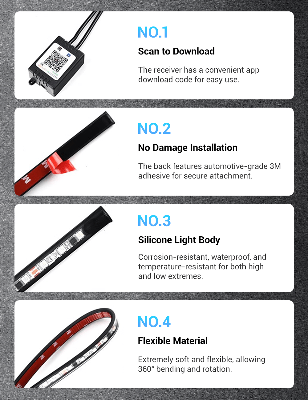 - 【Secure Adhesion】: With strong adhesive and cable ties, these LED strips stay securely in place, even through heavy rain, high-speed driving, and rough road conditions. Ensure a clean surface for installation to maximize adhesive strength.
