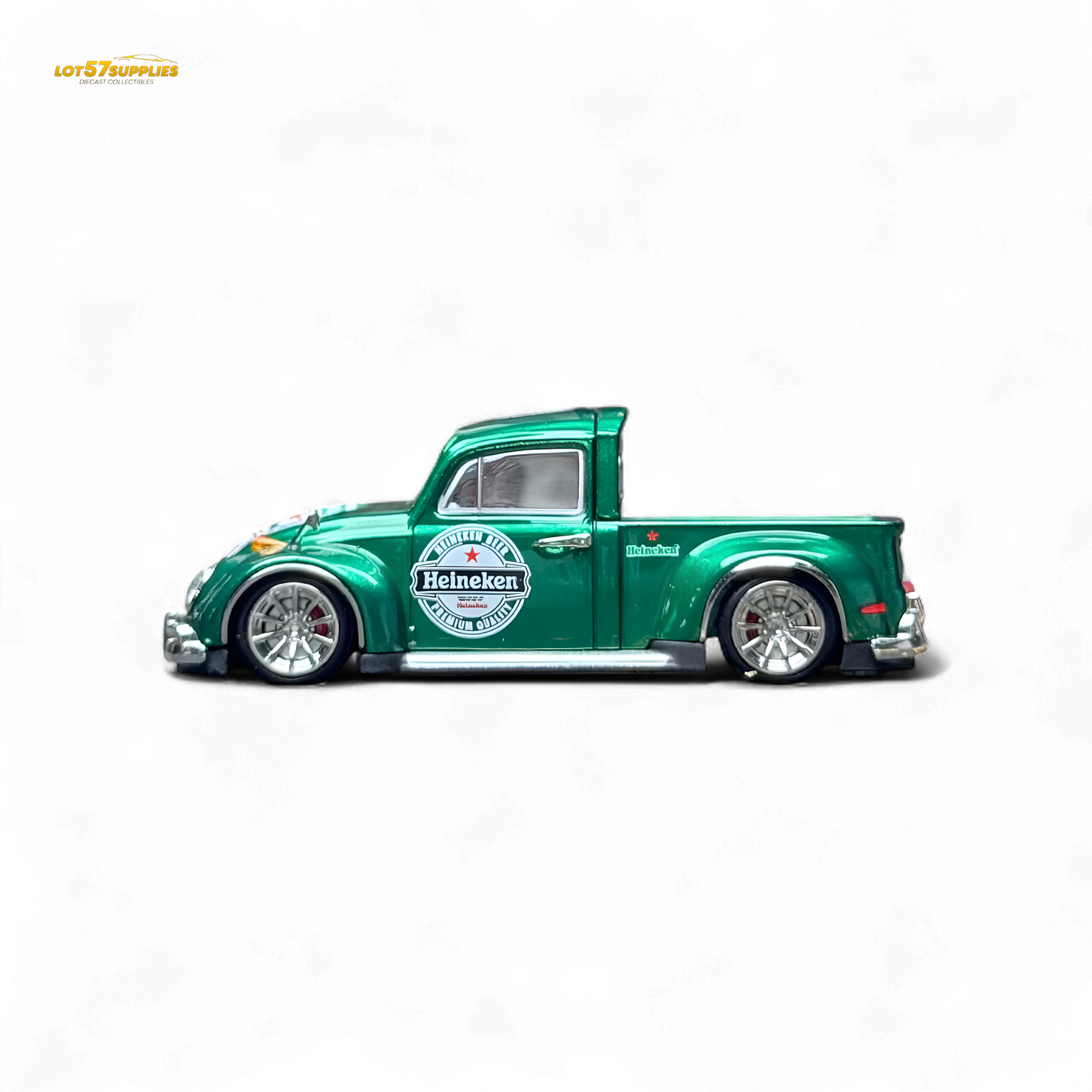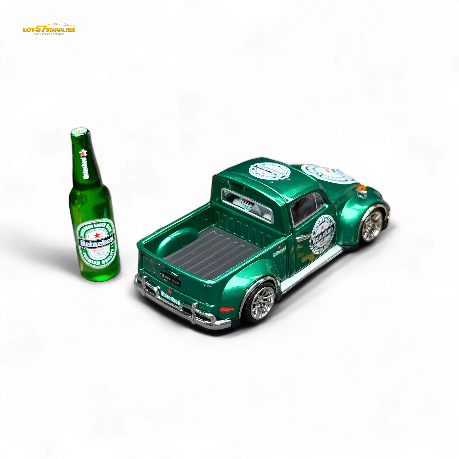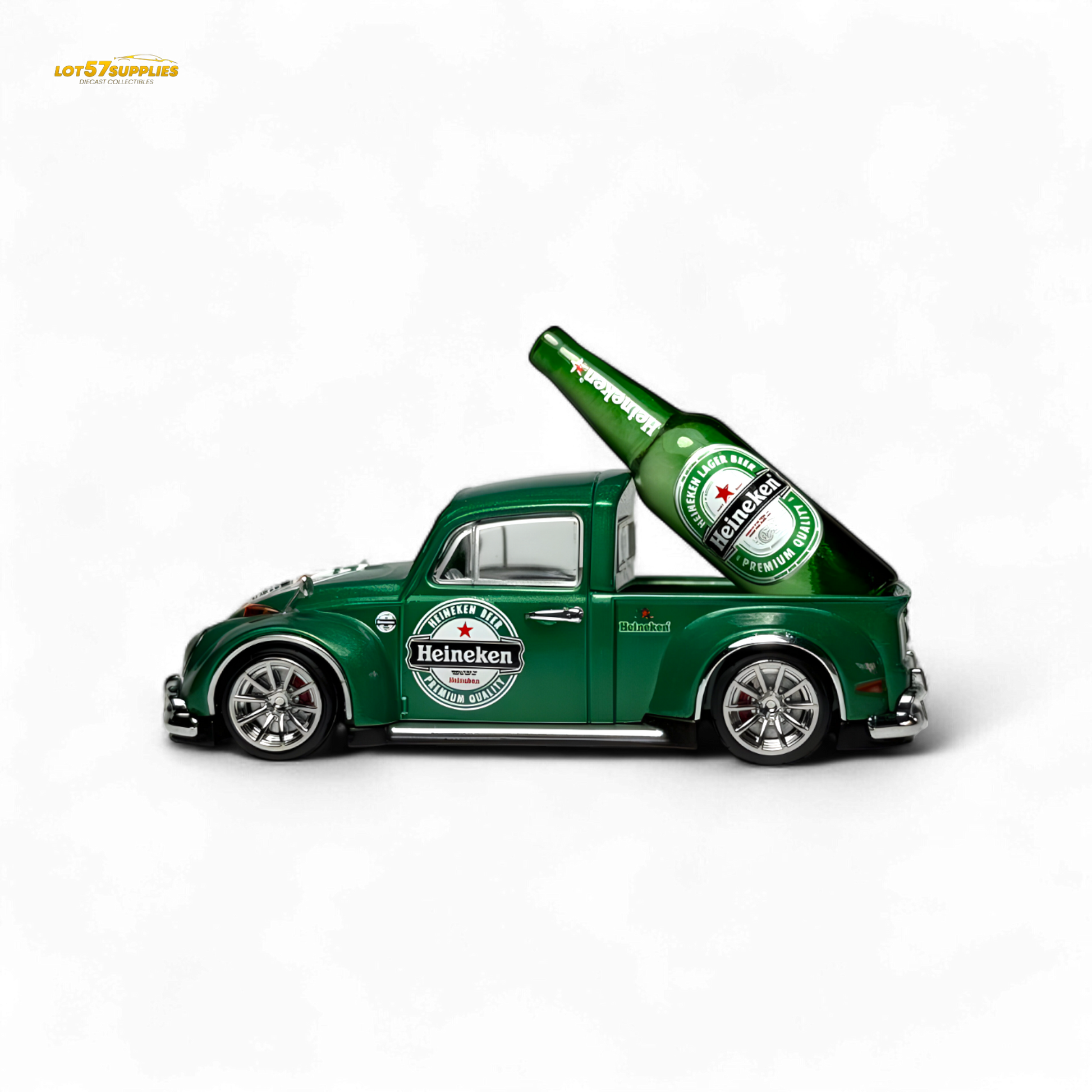 Pop the cap on this custom VW Beetle truck in vibrant Heineken green! This 1:64 scale casting comes slammed and styled with Heineken logos all over, perfectly matched with a realistic Heineken bottle prop for display. Silver deep-dish wheels and chrome bumpers finish off the vibe. This one’s for the diecast collectors who enjoy crisp details and chilled vibes.