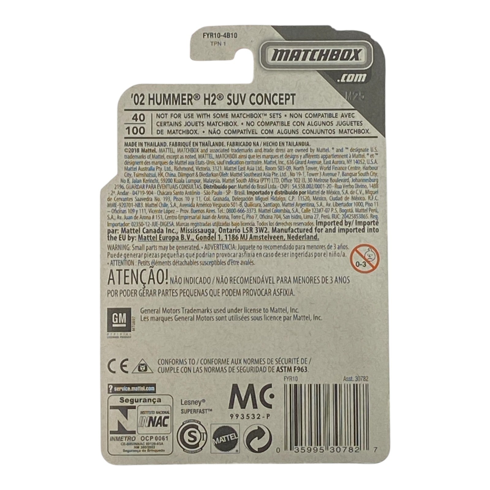 Whether you’re a dedicated Matchbox collector or someone who appreciates iconic cars, the Matchbox '02 Hummer H2 SUV Concept promises to be an exciting addition. With its striking colors and remarkable details, it stands as a testament to the vision of automotive design. Don’t miss out on the opportunity to own a piece of automotive history crafted by Matchbox.