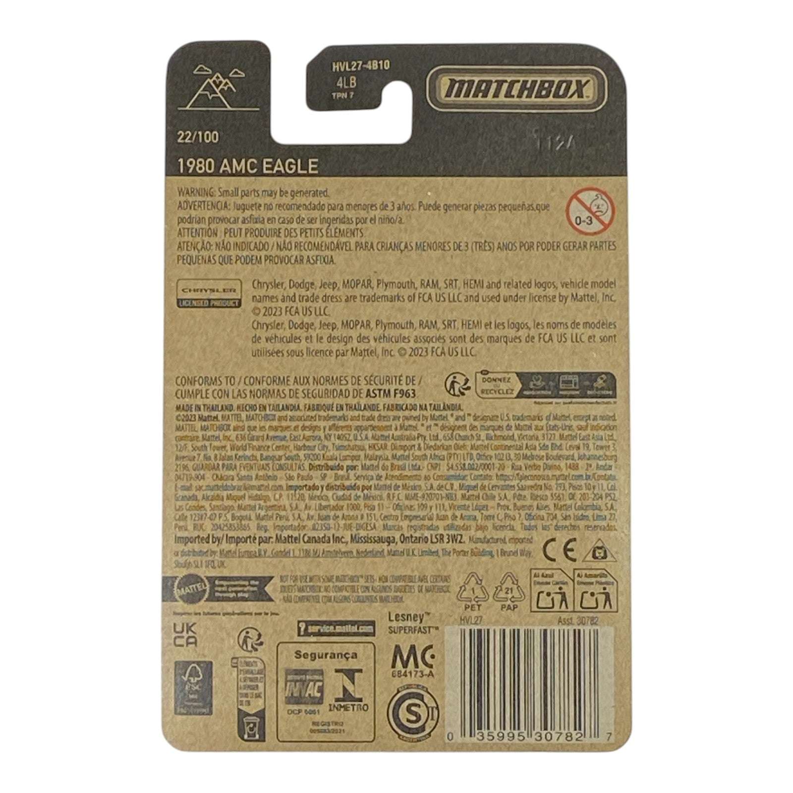 The Matchbox 1980 AMC Eagle is a timeless classic that invokes nostalgia among car enthusiasts and collectors alike. Released as part of the Matchbox Series 22/100, this finely detailed model showcases the unique design and features of the original vehicle.