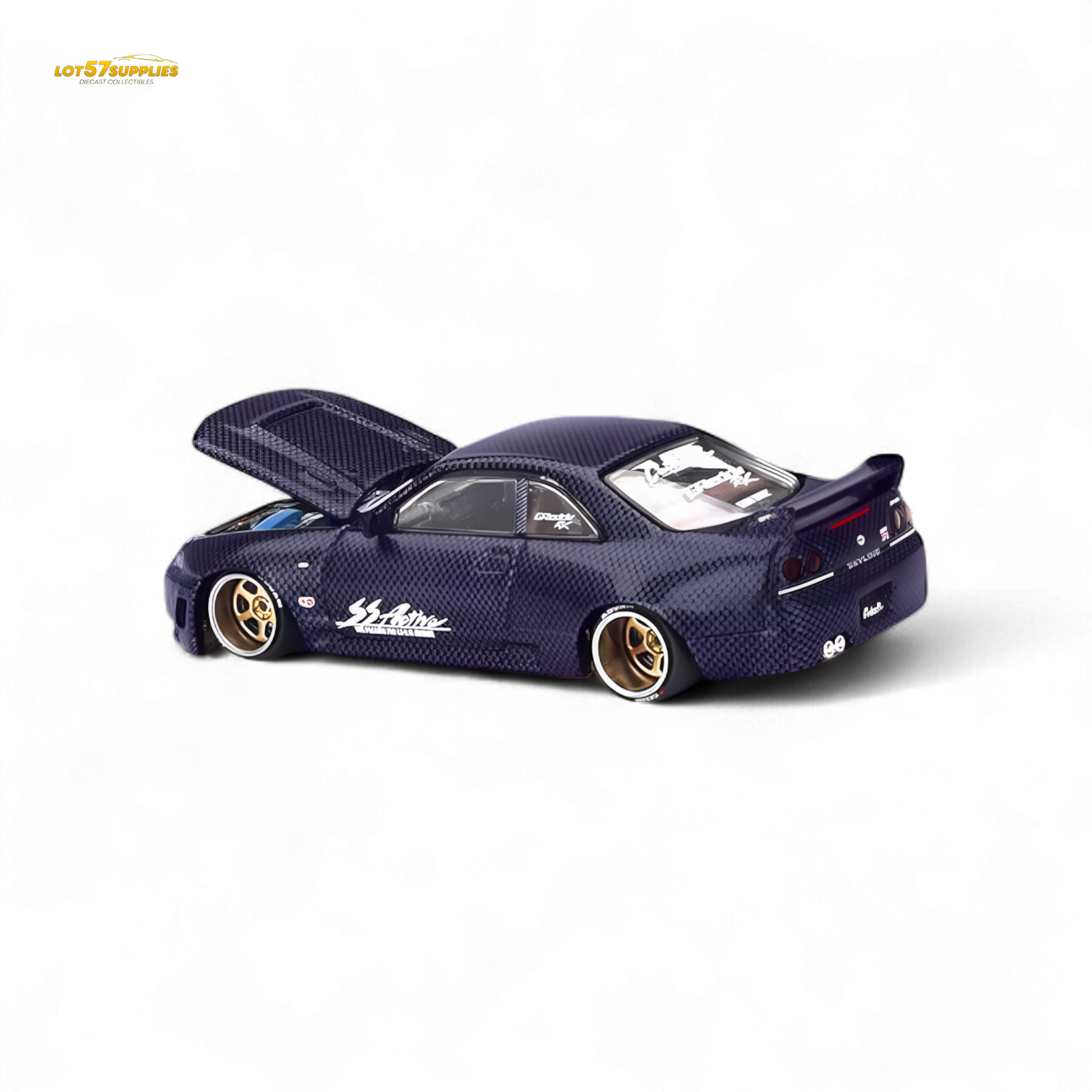 -Introducing the full carbon version of the Mini GT Kaido Works R33 GTR, featuring a full carbon body graphic inspired by the SS Active Carbon R