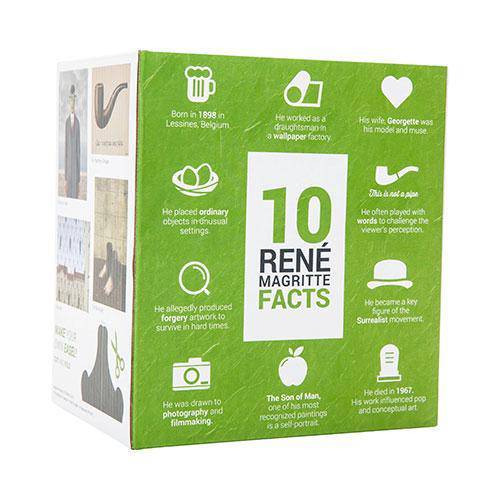 The René Magritte action figure comes with: Bowler hat. Signature pipe. Foot-shoe (inspired by the red model). 4 masterpieces and 1 cardboard easel. 10 fun facts about the artist on the box. Transparent base. The action figure is 5 inches tall and made of pvc. Warning: choking hazard. Small parts. This is not a toy. it is not designed nor intended for, children under the age of 12.