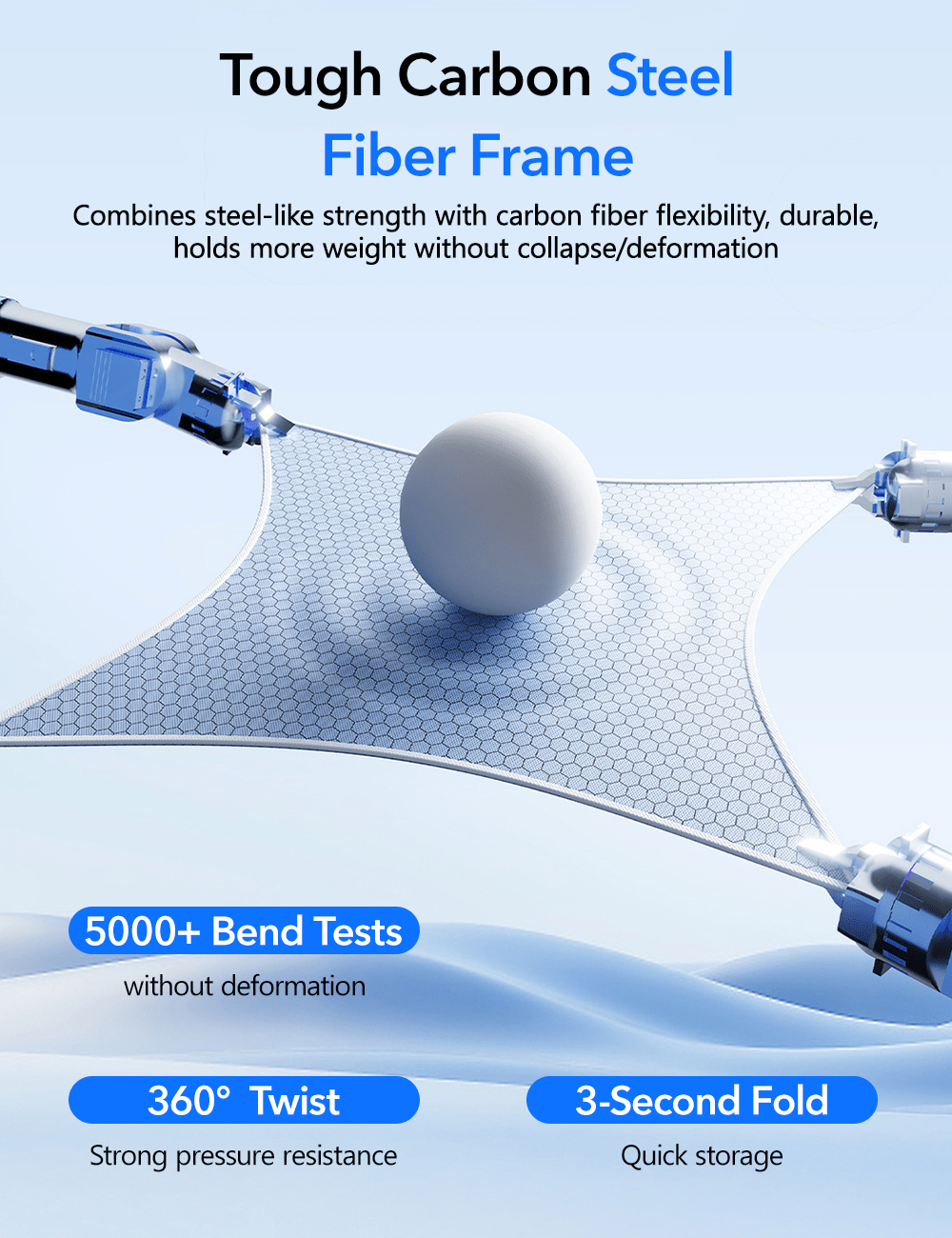 Robust high-strength carbon steel frame reinforced with flexible carbon fiber ensures a perfect, sag-free fit for lasting performance. |