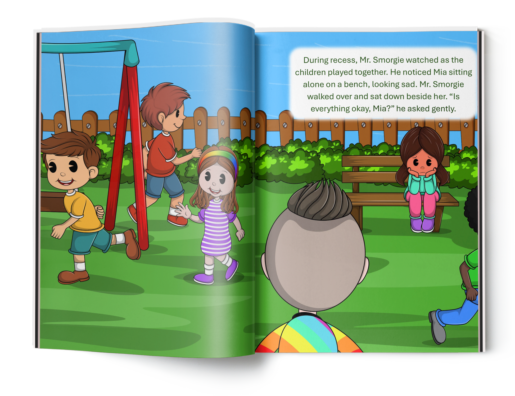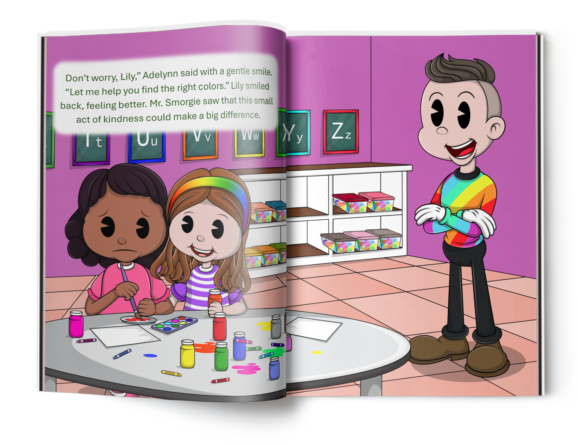 In Smorgie's Lesson in Kindness, Mr. Smorgie, a thoughtful and caring teacher, learns a valuable lesson from his students about the power of kindness. As the story unfolds, Mr. Smorgie notices the small acts of kindness his students share with one another, from helping a friend in need to sharing a smile. These simple gestures remind Mr. Smorgie of the importance of kindness and how it can make the world a better place.