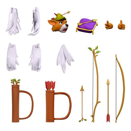Robin Hood: He's so handsome, just like his reward posters! This Robin Hood ULTIMATES! figure allows us to relive the classic 1970 film, Disney's Robin Hood, with the ability to be displayed as Robin Hood himself, or in a disguise that could fool his own mother! He's ready to win that golden arrow and the heart of Maid Marian! This 7" highly-articulated, made-to-order figure comes with a soft goods tunic, alternate heads and hands, and additional iconic accessories.