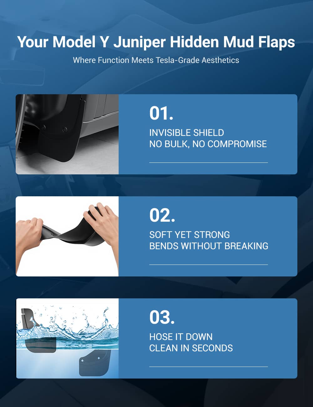 Don't compromise your Model Y Juniper's sleek design for protection. Our hidden mud flaps provide invisible defense against road debris, salt, and mud while maintaining the clean lines that make your Tesla stand out.
