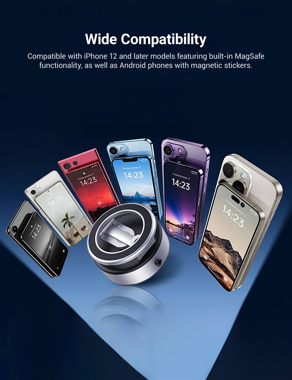Wide Compatibility: Compatible with iPhone 12 and later models featuring built-in MagSafe functionality, as well as Android phones with magnetic stickers.