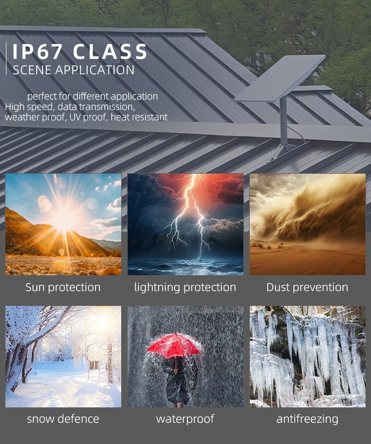 - All-Weather Resilience: Designed for reliable performance in various conditions, including intense sun, lightning, dust storms, heavy snow, driving rain (waterproof), and freezing temperatures (antifreezing). It's UV-proof and heat-resistant for consistent outdoor use.